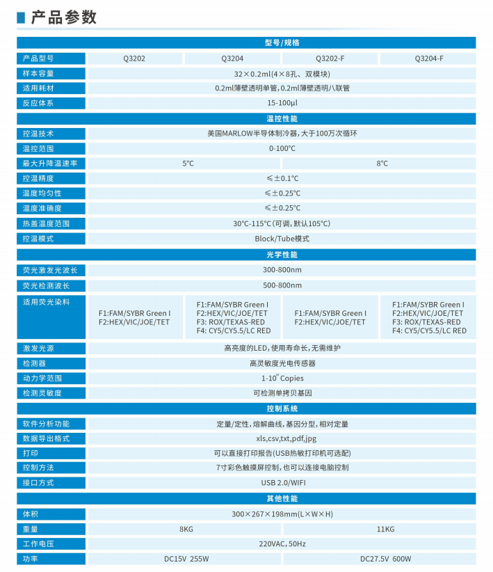 Q3200实时荧光定量PCR仪是一款便携式荧光定量PCR仪。本品采用四通道双16孔模块设计,可实现一机多用,以及内嵌7英寸高清TFT彩色触摸显示屏,WIN10操作系统,自带分析软件,无需电脑即可完成定量分析和打印报告。它采用美国MARLOW定制型帕尔贴模块、高灵敏度光电检测器等,以确保优越的性能和稳定的检测结果。